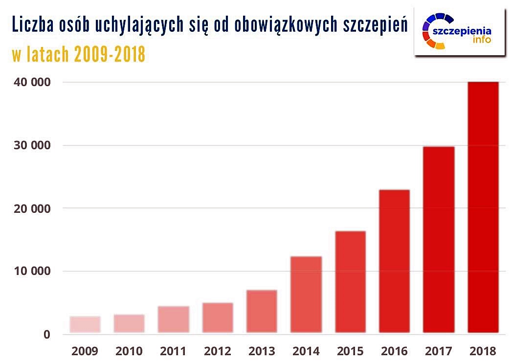 Z danych publikowanych w biuletynach Narodowego Instytutu Zdrowia Publicznego – Państwowego Zakładu Higieny i Głównego Inspektoratu Sanitarnego wynika, że liczba niezaszczepionych dzieci i młodzieży do 19. roku życia w ostatnich latach znacznie wzrosła. I tak: w 2010 r. odnotowano 3.437 odmów, w 2011 r. – 4.689, w 2012 r. – 5.340, w 2013 r. – 7.248, w 2014 r. – 12.681, w 2015 r. – 16.689, w 2016 r. – 23.147, w 2017 r. – 30.089.