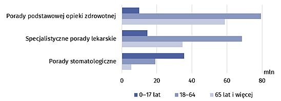 W ramach podstawowej opieki zdrowotnej dzieciom i młodzieży w wieku do 18 lat udzielono 35,6 mln porad (spadek w skali roku o 3,1%). Natomiast osobom w wieku 65 lat i więcej udzielono 58,8 mln (wzrost o 4,1% w porównaniu z rokiem poprzednim).