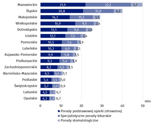 Porady ambulatoryjne według województw i rodzaju porad w 2019 r.