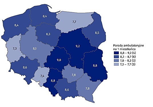 W 2019 r. przeciętna liczba porad ambulatoryjnych w przeliczeniu na 1 mieszkańca wyniosła 8,5. Największą wartość tego wskaźnika odnotowano w województwie mazowieckim (9,2), a najniższą w województwie lubuskim (7,3).