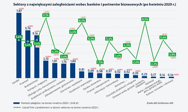- handel, którego niespłacone w terminie zobowiązania wynoszą 7,87 mld zł (23 proc. łącznej kwoty opóźnionych zobowiązań),