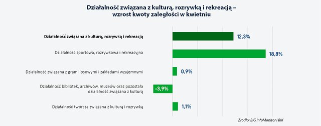 Natomiast na wzrost przeterminowanych zobowiązań sektora kultury, rozrywki i rekreacji złożyły się przede wszystkim kłopoty firm skoncentrowanych na działalności sportowej. Zaległości obiektów sportowych są jeszcze większe niż turystyki – zwiększyły się o ponad połowę z 28,3 do 44,3 mln zł.
