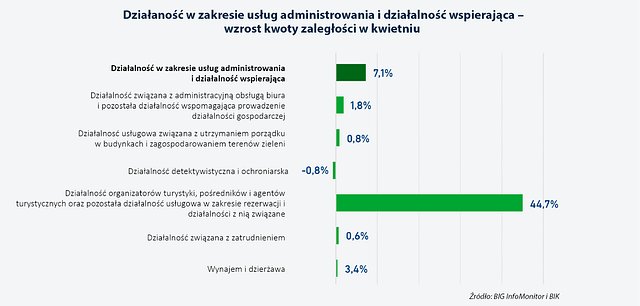 Źle wypadł też sektor administrowania i działalności wspierającej obejmującym m.in. organizatorów turystyki, zaległości zwiększyły się tu o ponad 7 proc. Przeterminowane zobowiązania wszystkich przedsiębiorstw wobec kontrahentów i banków podwyższyły się w kwietniu o 1,7 proc. z 33,16 do 33,73 mld zł – wynika z danych BIG InfoMonitor i BIK.