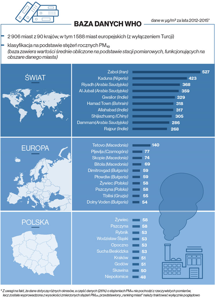 Wśród prawie 3 tys. miast z całego świata ujętych w bazie Światowej Organizacji Zdrowia (WHO), wg. danych za lata 2012 – 2015, w pierwszej setce najbardziej zanieczyszczonych państw europejskich pod względem PM10 znajdowało się aż 45 polskich miast.