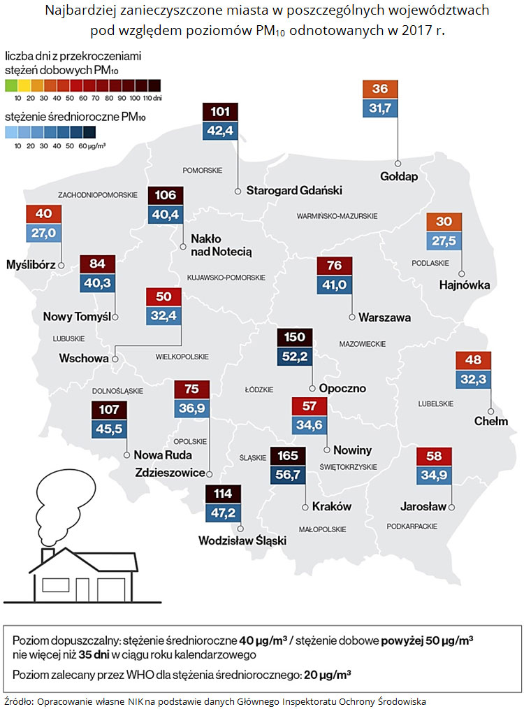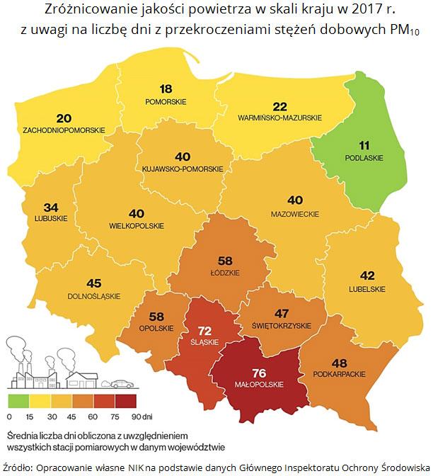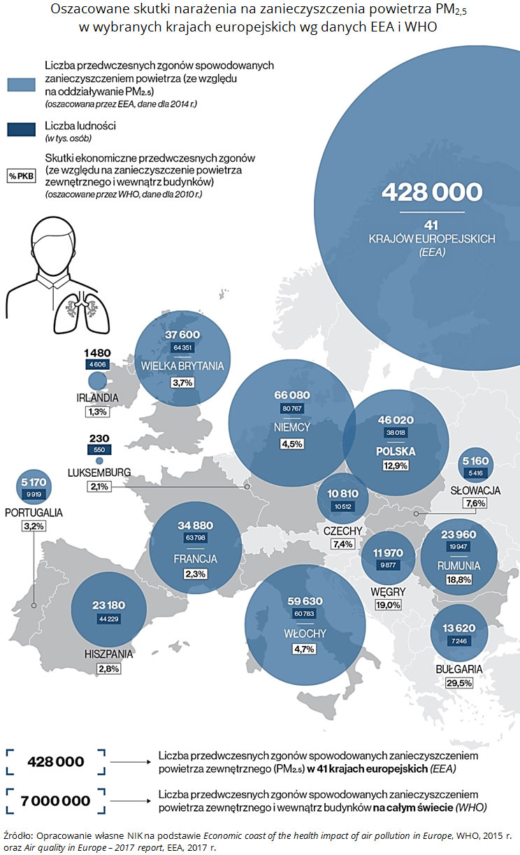 Mimo znacznego zmniejszenia zanieczyszczenia powietrza w ostatnich kilkudziesięciu latach (głównie wskutek wprowadzenia bardziej restrykcyjnych wymagań dla przemysłu), jakość powietrza w Polsce dalece odbiega od standardów UE. Od czasu poprzedniej kontroli NIK dotyczącej problematyki ochrony powietrza (P/14/086) sytuacja Polski na tle innych krajów UE niewiele się zmieniła. Biorąc pod uwagę zanieczyszczenie powietrza PM10, PM2,5 oraz B(a)P, Polska jest jednym z krajów UE z najgorszą jakością powietrza. Z danych raportu Europejskiej Agencji Środowiska (EEA) z 2017 r. wynika m.in., że w 2015 r. spośród 28 krajów UE najczęstsze przekroczenia stężeń dobowych PM10 (w skali całego kraju) występowały w Bułgarii, a zaraz potem w Polsce. Z kolei w przypadku PM2,5 oraz B(a)P wysokość stężeń rocznych tych substancji w 2015 r. plasowała Polskę na pierwszym miejscu wśród najbardziej zanieczyszczonych krajów UE.