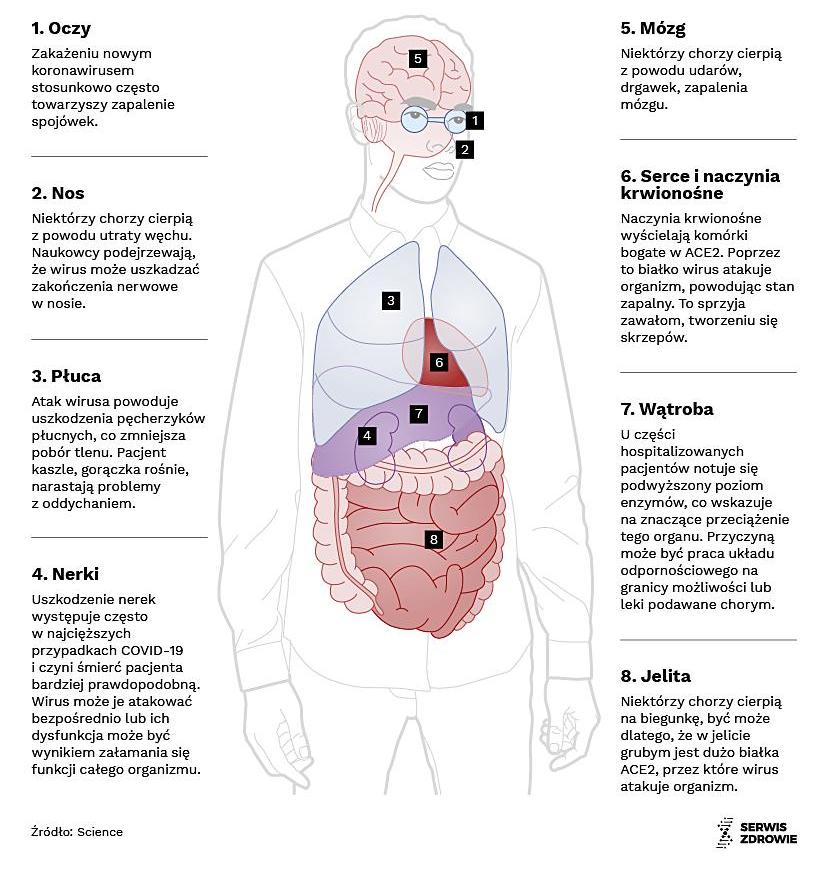 ACE2 znajduje się w wielu komórkach ludzkiego organizmu, przede wszystkim w pęcherzykach płucnych. Do wnętrza ludzkiego ciała wirus dostaje się przez nos. Najpierw atakuje gardło, a potem wnika do organizmu. U osoby zdrowej tlen z pęcherzyków dostaje się do naczyń włosowatych i dalej jest roznoszony po całym organizmie. Kiedy zaczyna się infekcja wywołana koronawirusem, białe ciałka krwi uwalniają przeciwzapalne molekuły zwane cytokinami. Zabijają one zainfekowane komórki wyścielające pęcherzyki. Rozwija się zapalenie płuc, któremu towarzyszy gorączka, kaszel i problemy z oddychaniem.