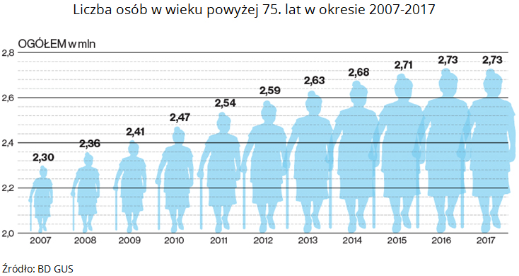 W Polsce pogłębia się proces starzenia społeczeństwa, o czym świadczy wzrost udziału osób w wieku powyżej 75. roku życia w ogóle ludności. Odsetek tych osób w latach 2007 – 2011 wynosił 6 proc. ogółu ludności, a w latach 2012-2017 wzrósł do poziomu 7 proc.