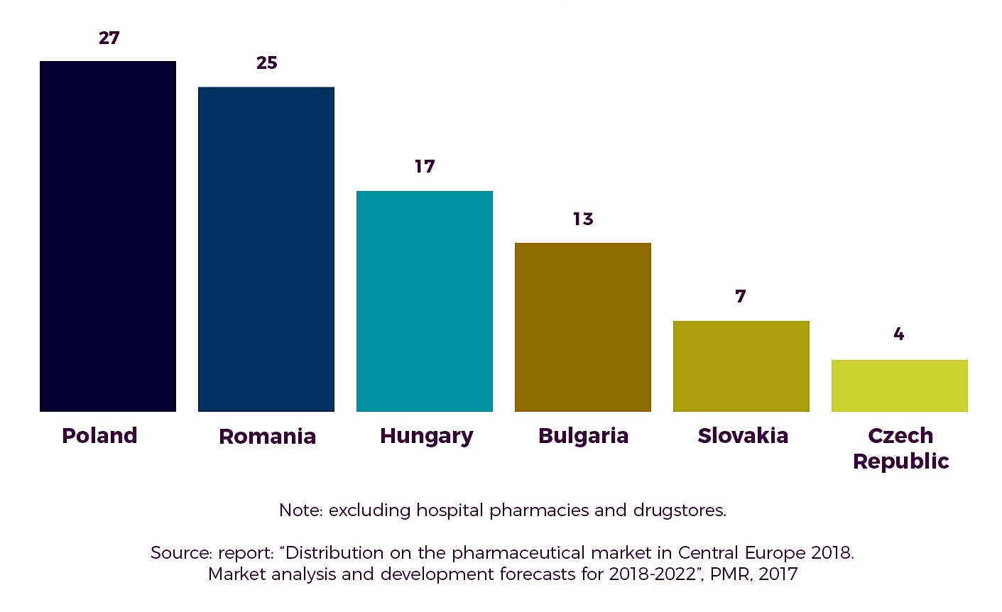 Najwyższa średnia liczba aptek przypadająca na jedną hurtownię farmaceutyczną w analizowanych krajach Europy Środkowej obserwowana jest w Polsce – 27. To znacznie więcej niż średnia CE wynosząca – 15 – wynika z danych firmy PMR.