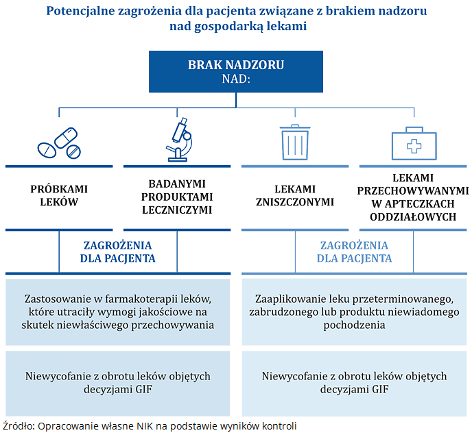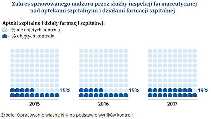 NIK zwraca uwagę, że przyczyną stwierdzonych nieprawidłowości związanych z bezpieczeństwem farmakoterapii może być niewystarczający nadzór służb inspekcji farmaceutycznych nad aptekami szpitalnymi i działami farmacji. W 2017 r. wojewódzkie inspektoraty farmaceutyczne skontrolowały jedynie 19 proc. aptek i działów farmacji szpitalnej w Polsce. W latach poprzednich kontroli było jeszcze mniej.
