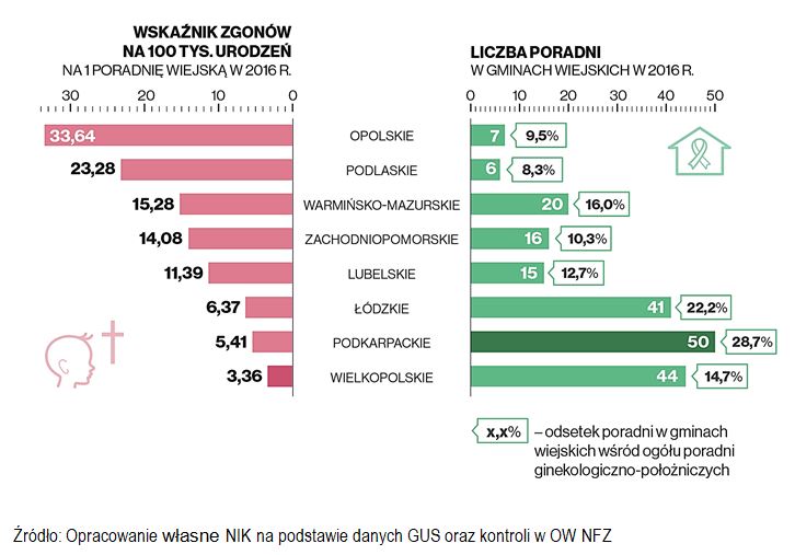 W województwach o małej liczbie poradni wiejskich w 2016 roku odnotowano największy wskaźnik zgonów okołoporodowych – 33,64/100 tys. urodzeń w woj. opolskim i 23,28/100 tys. urodzeń w woj. podlaskim. Zdecydowanie lepiej w tym zakresie przedstawiała się sytuacja w województwach o większej liczbie poradni. W woj. podkarpackim relacja ta wynosiła bowiem 5,41 na 100 tys. urodzeń, a w woj. wielkopolskim 3,36 na 100 tys. urodzeń.