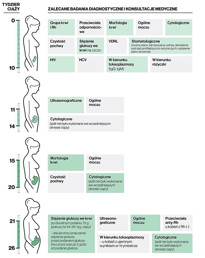 Poszczególne elementy opieki medycznej mającej na celu uzyskanie dobrego stanu zdrowia matki i dziecka zostały określone w standardach opieki okołoporodowej. Wymieniono w nich zalecane świadczenia profilaktyczne i działania w zakresie promocji zdrowia oraz badania diagnostyczne i konsultacje medyczne w okresie ciąży, wraz z okresem ich przeprowadzania – począwszy od 10. tygodnia ciąży do jej rozwiązania.