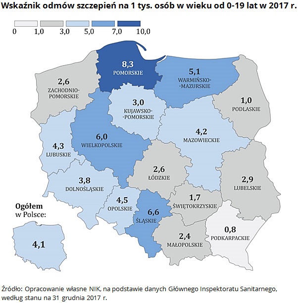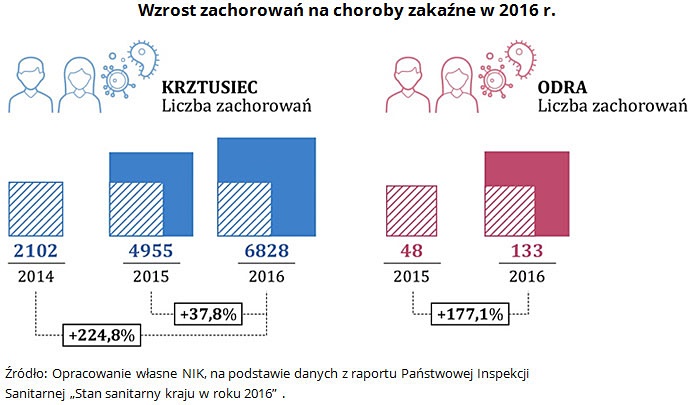 Zdaniem NIK ta tendencja wzrostowa może, w przyszłości, skutkować zagrożeniem epidemiologicznym i odrodzeniem się chorób dziś uważanych za „wymarłe”. Na przykład występuje systematyczny wzrost zachorowań na krztusiec (koklusz). w 2016 r. liczba chorych powiększyła się o ponad 224 proc. w stosunku do 2014 r. Więcej jest także zachorowań na odrę. W 2016 r. ich liczba wzrosła o ponad 177 proc. w porównaniu do 2015 r.