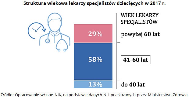 Duży odsetek lekarzy po 60 roku życia jest także wśród specjalistów dziecięcych. Szczególnie źle pod tym względem wygląda sytuacja w trzech specjalizacjach – chirurgii dziecięcej (ponad 39 proc. lekarzy po 60 roku życia), neurologii dziecięcej (39 proc.), otolaryngologii dziecięcej (blisko 37 proc.). Może to, w perspektywie kilku lat, skutkować odejściem z zawodu znacznej liczby specjalistów, a tym samym zmniejszyć dostępność świadczeń zdrowotnych.