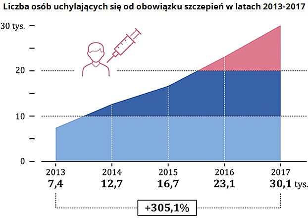 NIK alarmuje, że z roku na rok rośnie liczb osób uchylających się od obowiązku szczepień. W 2017 r. było ich ponad 30 tys., czyli o 30 proc. więcej niż w 2016 r. Od 2013 r. do 2017 r. liczba ludzi odmawiająca obowiązkowych szczepień wzrosła o ponad 305 proc.