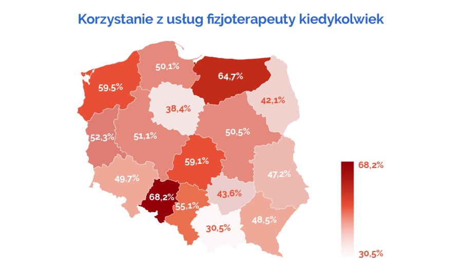 Analizując wyniki można zauważyć, że są województwa, w których odsetek korzystających z usług fizjoterapeutów jest stosunkowo wysoki i przekracza 60 proc. (np. opolskie czy warmińsko-mazurskie). Z drugiej strony w województwach małopolskim i kujawsko-pomorskim wskaźnik ten spada poniżej 40 proc.