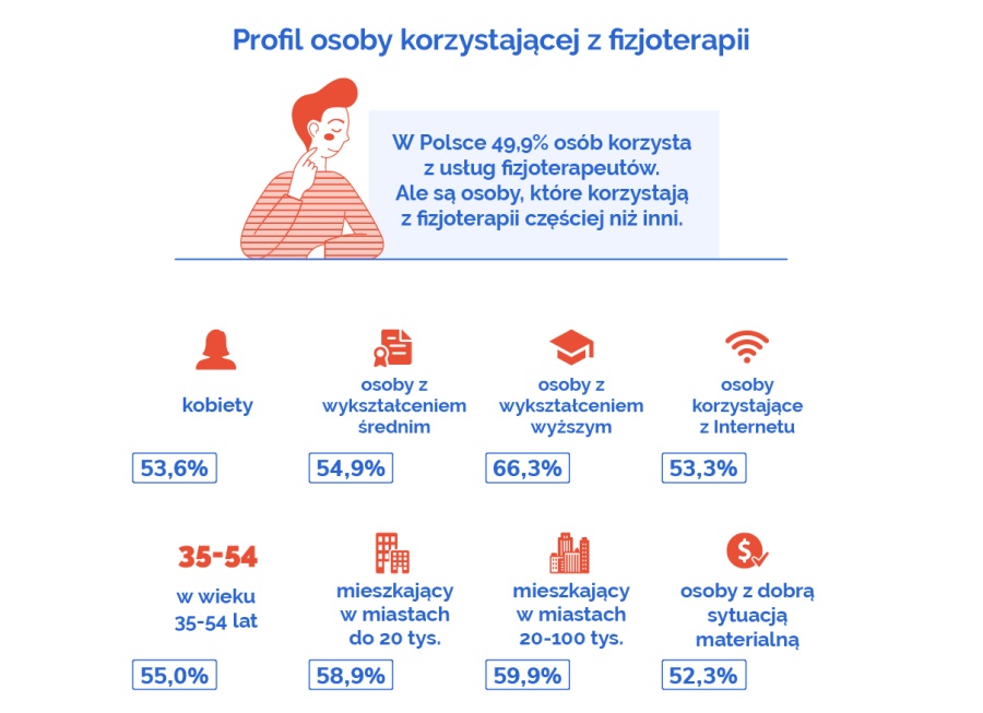 Z fizjoterapii częściej korzystają kobiety (53,6%), osoby w wieku 34-55 (55%), osoby korzystające z Internetu (53,3%), dobrze sytuowane oraz te ze średnim i wyższym wykształceniem.