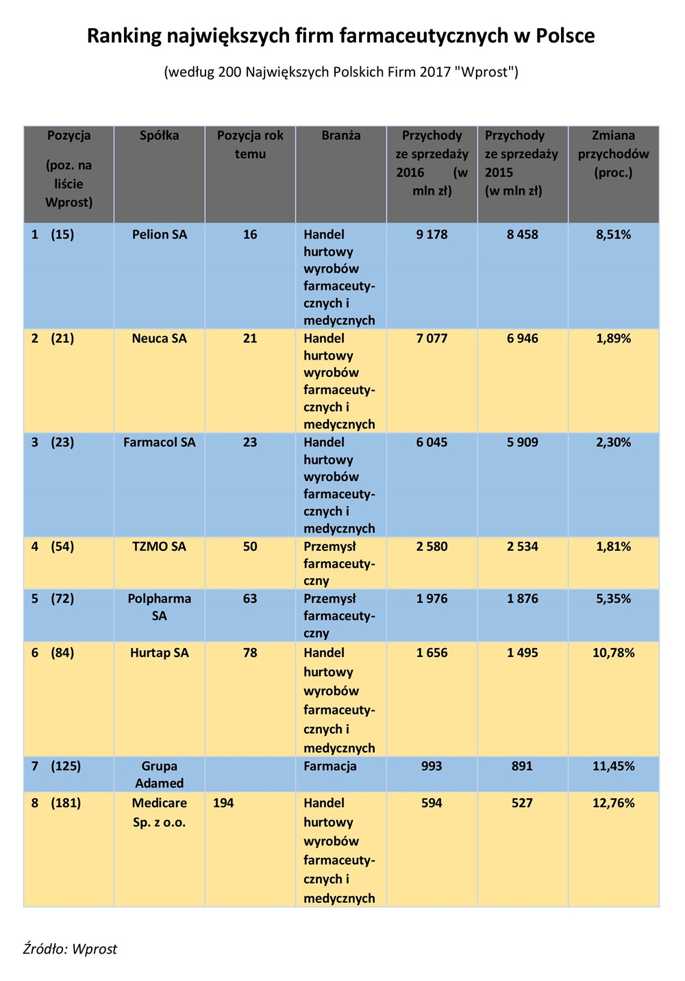 Oto największe polskie firmy farmaceutyczne sklasyfikowane w zestawieniu 200 Największych Polskich Firm 2017 magazynu „Wprost”: