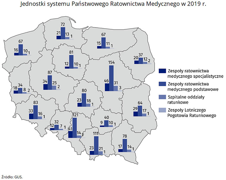 W ramach Systemu Państwowe Ratownictwo Medyczne w 2019 r. funkcjonowało 1577 zespołów ratownictwa medycznego (369 specjalistycznych i 1208 podstawowych). Doraźnej pomocy medycznej udzielało również Lotnicze Pogotowie Ratunkowe (z 21 baz) oraz personel medyczny 237 szpitalnych oddziałów ratunkowych. Z systemem PRM współpracowało 155 izb przyjęć, 17 centrów urazowych udzielających świadczeń opieki zdrowotnej pacjentom z mnogimi wielonarządowymi obrażeniami ciała oraz 8 centrów urazowych dla dzieci.