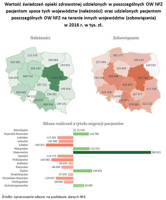 W oddziałach wojewódzkich Funduszu: Dolnośląskim, Kujawsko-Pomorskim, Małopolskim, Mazowieckim, Śląskim i Zachodniopomorskim odnotowano (podobnie jak w roku 2015) dodatni bilans rozliczeń z tytułu migracji. Oznacza to, że wartość świadczeń udzielonych pacjentom przyjeżdżającym do tych oddziałów wojewódzkich z pozostałych regionów Polski w celu realizacji świadczeń zdrowotnych była wyższa od wartości świadczeń zdrowotnych udzielonych pacjentom z tych oddziałów na terenie pozostałych oddziałów wojewódzkich Funduszu. Pozostałe oddziały wojewódzkie NFZ odnotowały ujemny bilans rozliczeń z tytułu migracji osób ubezpieczonych. Pacjenci najchętniej przyjeżdżali na leczenie na Mazowsze.