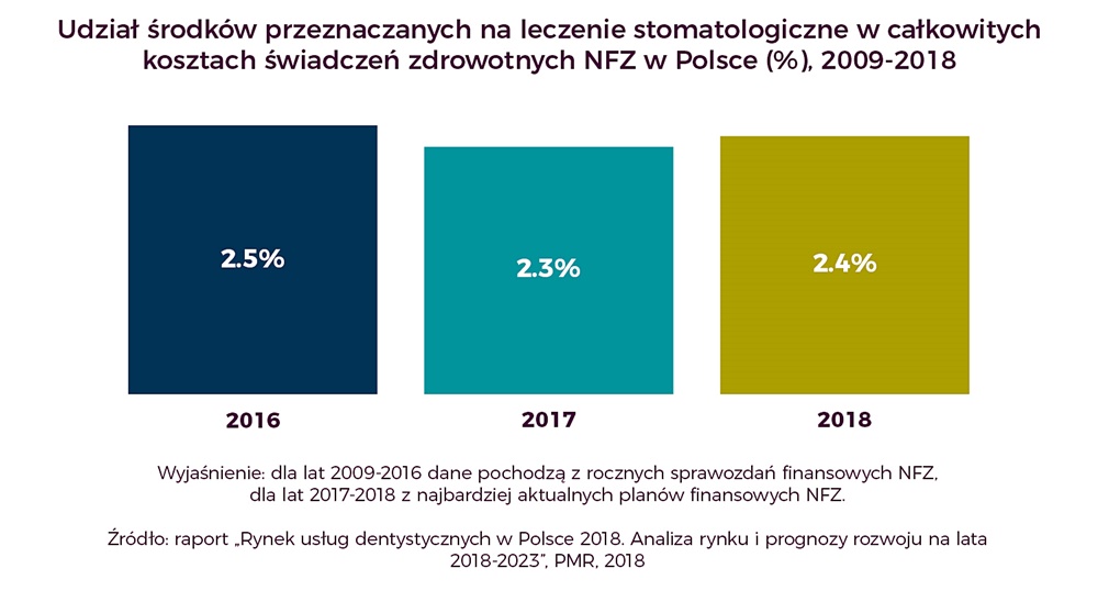 Pomimo tego, udział wydatków na opiekę dentystyczną w całkowitych kosztach świadczeń zdrowotnych sukcesywnie maleje, co pokazuje, że stomatologia nie jest świadczeniem priorytetowym dla funduszu.