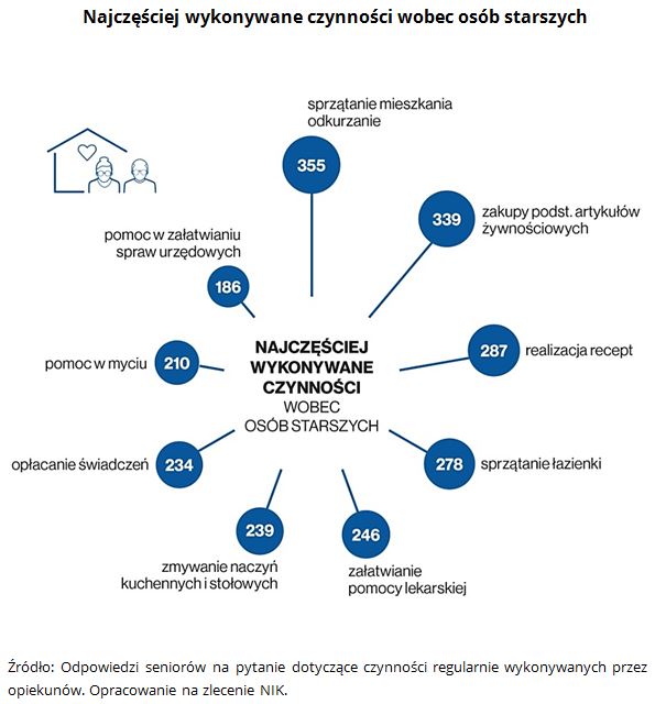 NIK zauważa, że nieokreślenie zakresu usług, które powinny być wykonane w ramach tego świadczenia, nie gwarantuje, że zostanie ono rzetelnie zrealizowane. Gdy nie wiadomo, co mają dokładnie w ramach swoich zadań robić opiekunowie świadczący usługi opiekuńcze, niemożliwa jest faktyczna ocena poziomu ich pracy. W rezultacie nie rozliczano ich za wykonanie poszczególnych zadań, lecz za czas poświęcony starszej osobie. Dlatego kontrola dla celów rozliczeń finansowych sprowadzała się jedynie do weryfikacji kart pracy opiekunów i ustalenia liczby zrealizowanych godzin.