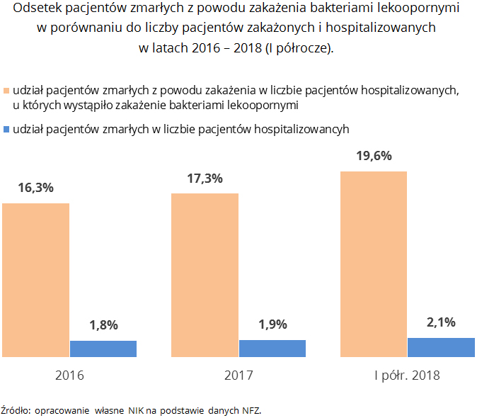 Według informacji NFZ, uzyskanych w czasie kontroli, spośród 20.709 pacjentów hospitalizowanych w latach 2016 – 2018 (I półrocze) z powodu zakażenia bakteriami lekoopornymi zmarło 3.603 pacjentów, tj. 17,4%, podczas gdy w przypadku pacjentów pozostałych wskaźnik ten wynosi 1,9%. Z porównania tych wskaźników wynika, że prawdopodobieństwo zgonu pacjenta zakażonego w szpitalu bakterią lekooporną jest 8-krotnie wyższe niż w przypadku pacjenta niezakażonego.
