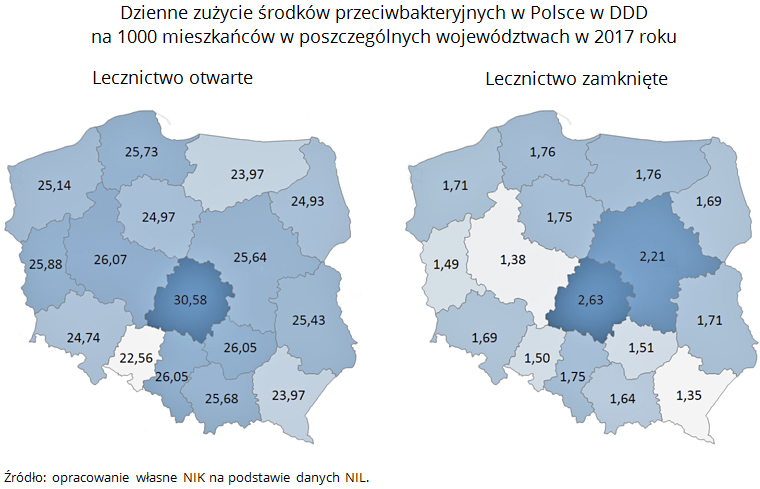 Kontrola NIK pokazała niedostateczne wykorzystywanie diagnostyki mikrobiologicznej zarówno w szpitalach jak i podstawowej opiece zdrowotnej. Średnia liczba badań mikrobiologicznych, podejmowanych w celu wczesnego wykrycia zakażenia oraz ustalenia grup antybiotyków możliwych do wykorzystania, w przeliczeniu na 1 łóżko szpitalne w danym roku, była ok. dwukrotnie niższa niż w krajach UE (średnio 54 badania) i wyniosła: 22,4 w 2016 r., 24,5 w 2017 r. i 13 w 2018 r. (I półrocze).