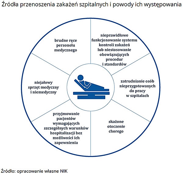 Zakażenia szpitalne, związane z udzielaniem świadczeń zdrowotnych, stanowią poważny problem wszystkich szpitali, nawet w krajach o najwyższych standardach opieki zdrowotnej. Dotyczą od 5 do 10 proc. osób leczonych szpitalnie. Zakładając, że w polskich szpitalach ulega zakażeniom tylko 5 proc. procent pacjentów to i tak daje to ok. 400 tys. osób. Źródłem przenoszenia bakterii mogą być m. in. brudne ręce personelu medycznego, niejałowy sprzęt, skażone otoczenie chorego, przyjmowanie pacjentów wymagających szczególnych warunków hospitalizacji bez ich zapewnienia, zatrudnianie osób nieprzygotowanych do pracy w szpitalach.