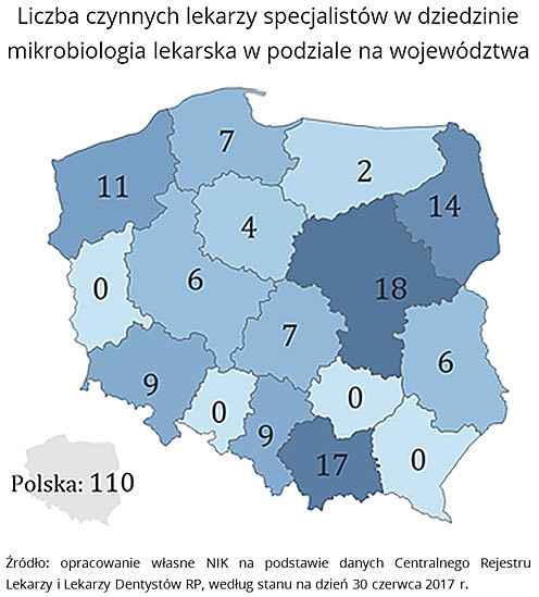 Na dzień 30 czerwca 2017 r. w Polsce było zawodowo czynnych tylko 110 lekarzy specjalistów w dziedzinie mikrobiologii, w tym 61 w wieku powyżej 55 lat. Według NIK, taka sytuacja nie daje gwarancji należytego sprawowania ciągłego i bieżącego nadzoru epidemiologicznego.